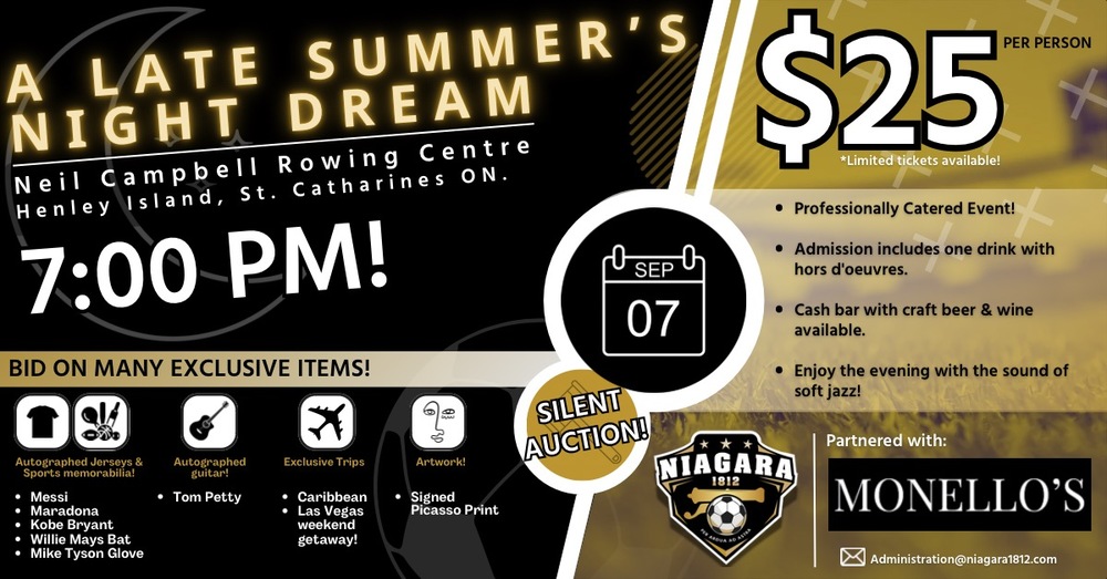 Welcome to A Late Summer's Night Dream! Get ready to immerse yourself in a magical night at the Neil Campbell Rowing Centre on Sat, Sep 07, 2024 at 7:00 PM. Indulge in music, delectable food, and great company as we bid farewell to summer in grand style. Make unforgettable memories with us and be part of a night to remember. Don't miss out on this spectacular event that culminates with a silent Auction featuring exclusive items such as autographed memorabilia - a Tom Petty guitar, Mike Tyson boxing glove, DeNiro, Pacino and a dream trip to the Caribbean!